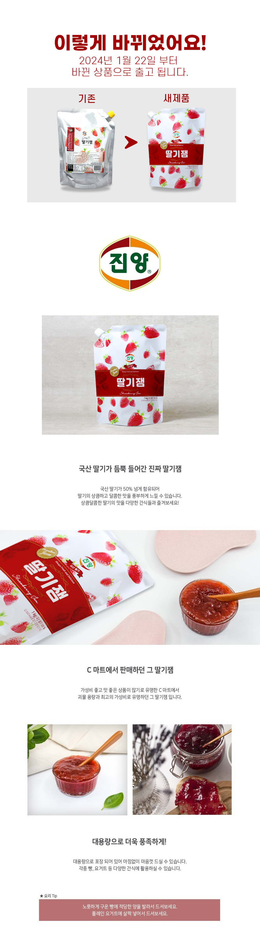 진양 딸기잼 파우치 1kg 1개 / 2+1개